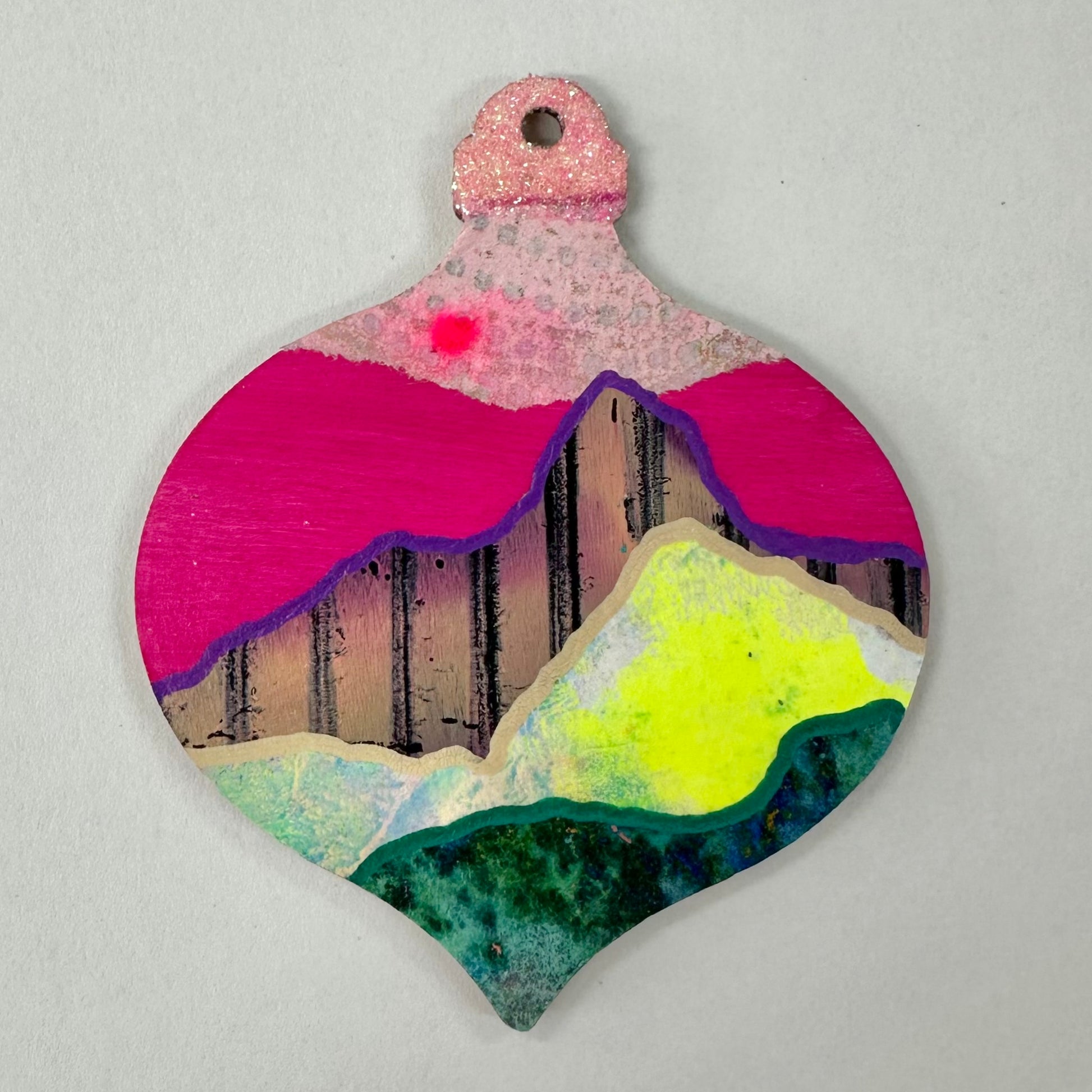 Handpainted lightweight wooden bauble. Painted with quality acrylic paint, collaged with little landscapes and finished with a glittery top. Sealed with a coat of polyurethane sealer.