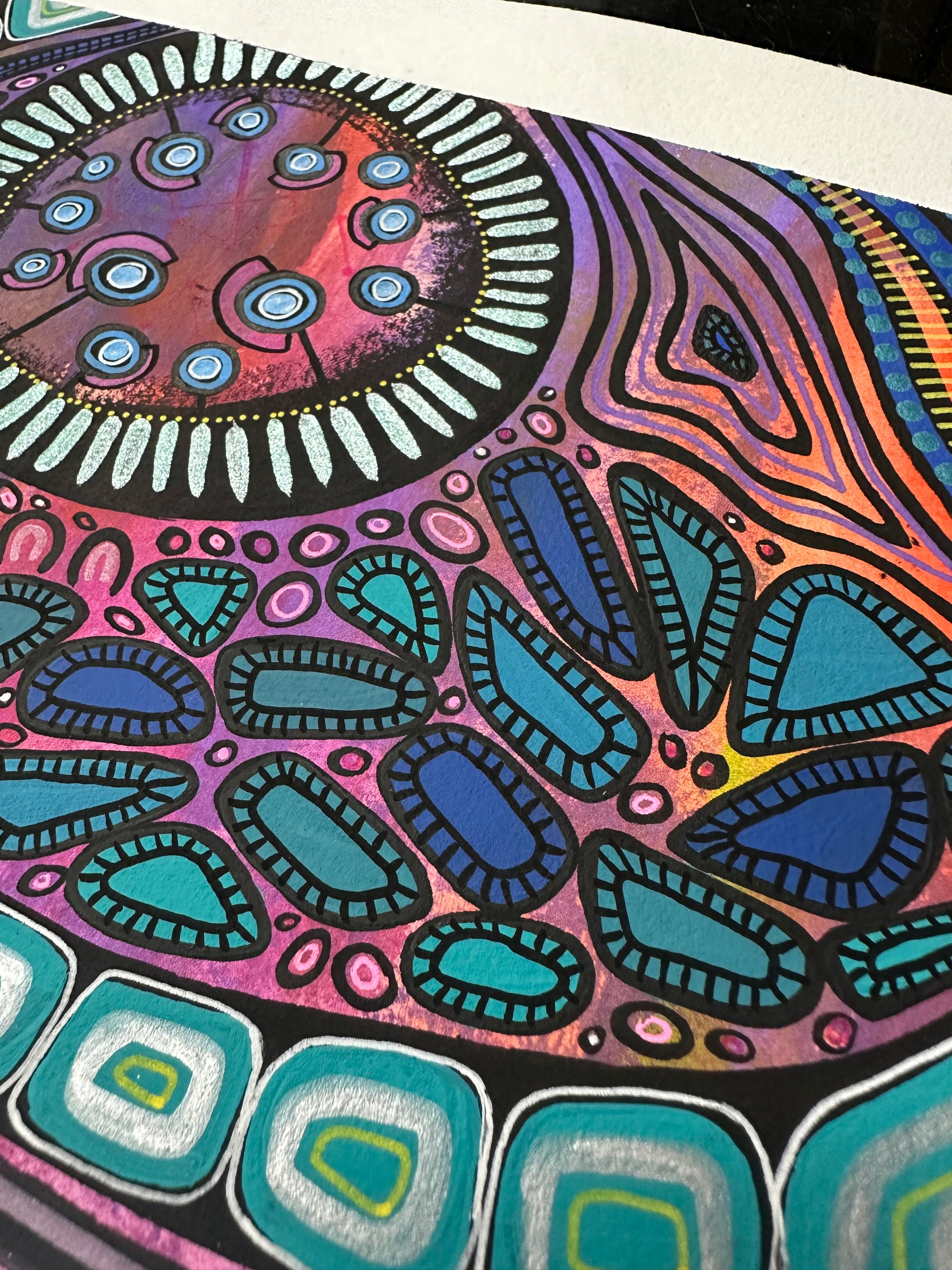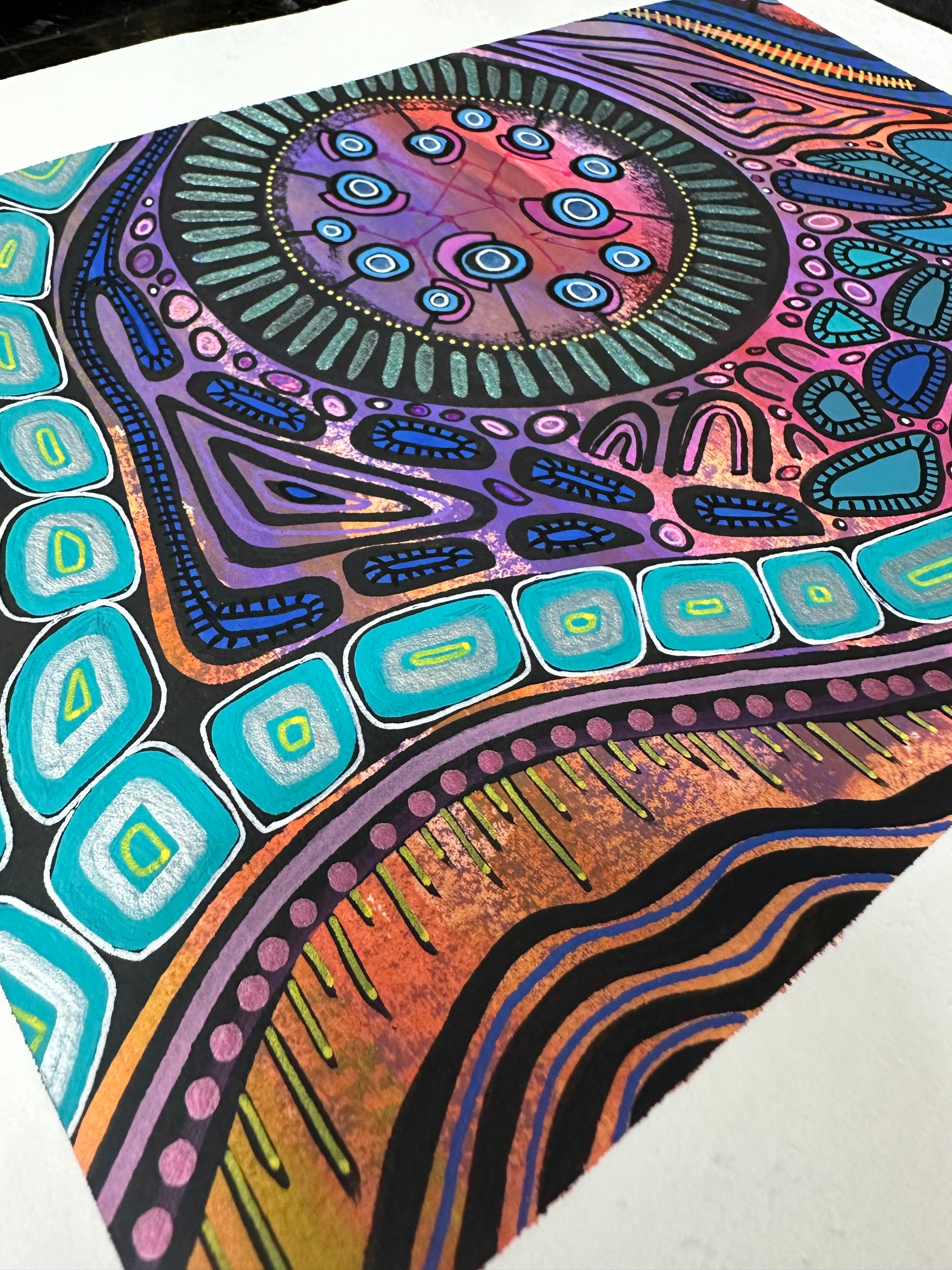 MATERIALS: Acrylic paint, paint and gel pens on 300gsm cotton paper.