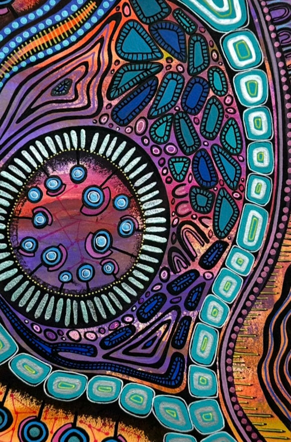 This artwork began with the circle and inside the circle are 'trees'. Trees may symbolise growth, life and connection, and circles may represent unity and wholeness. The many different lines can represent the ladders we climb, along with the mountain shapes. The lines are straight and direct, and know what they want.
