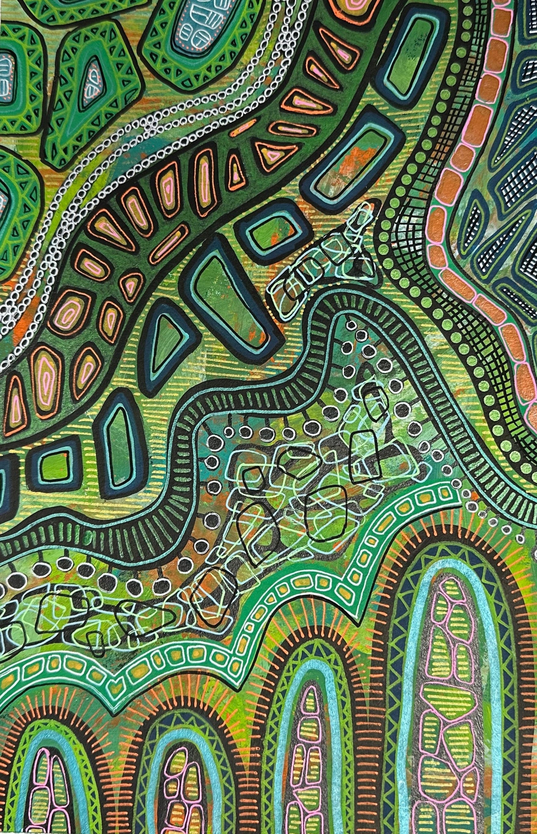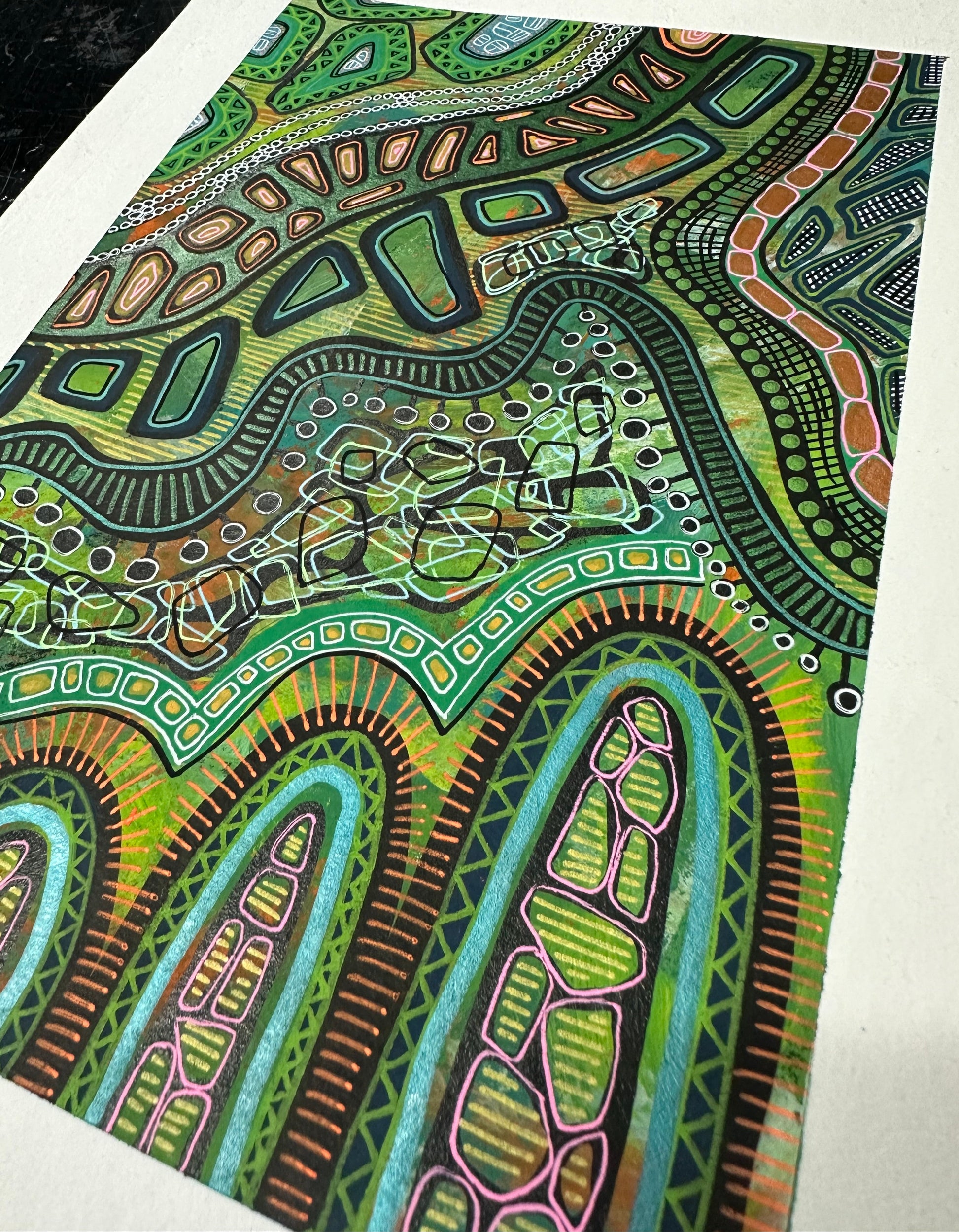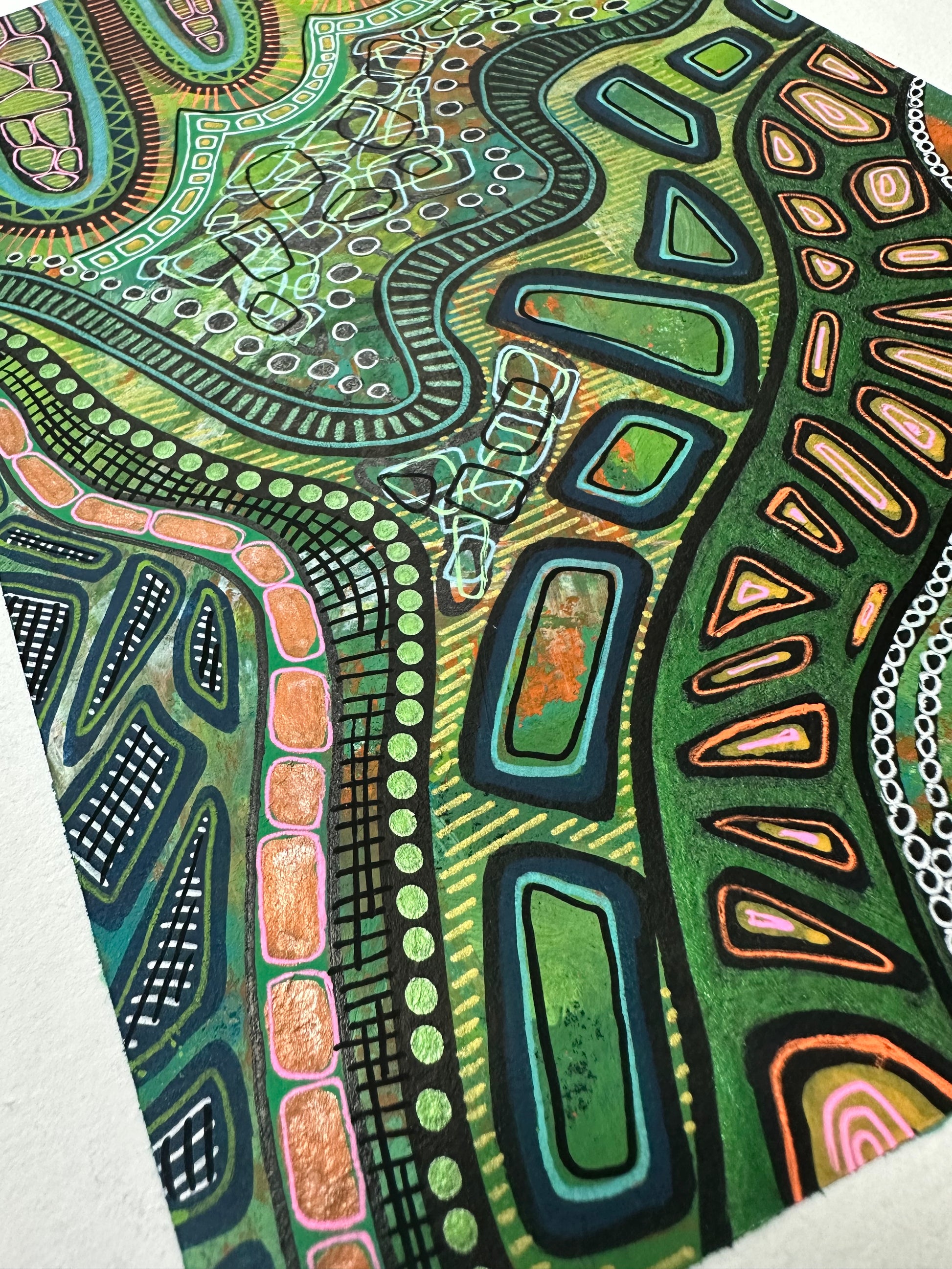 MATERIALS: Acrylic paint, paint and gel pens on 300gsm cotton paper.