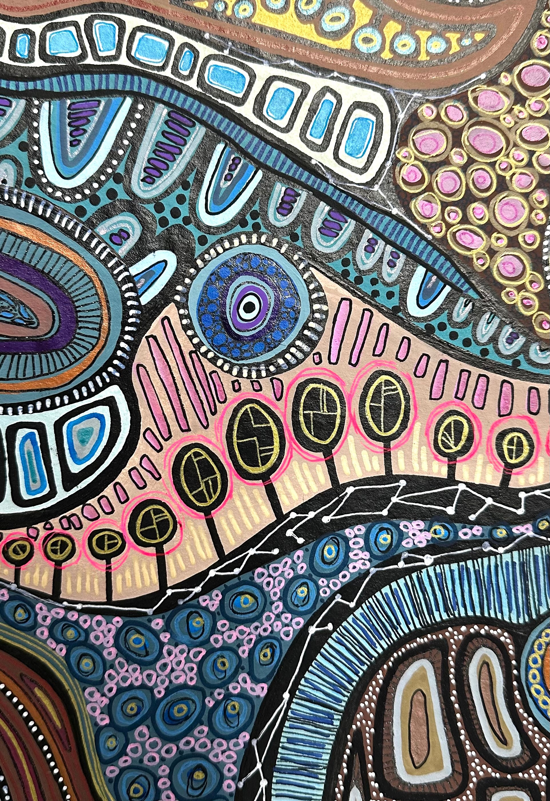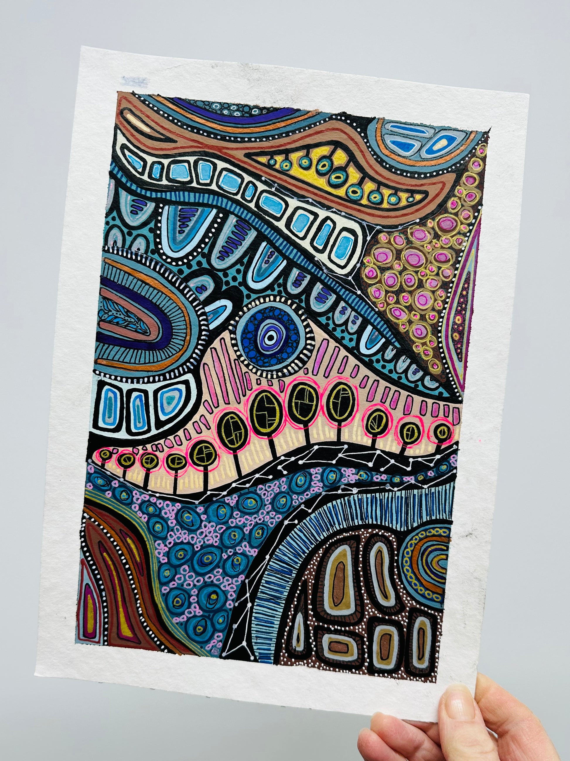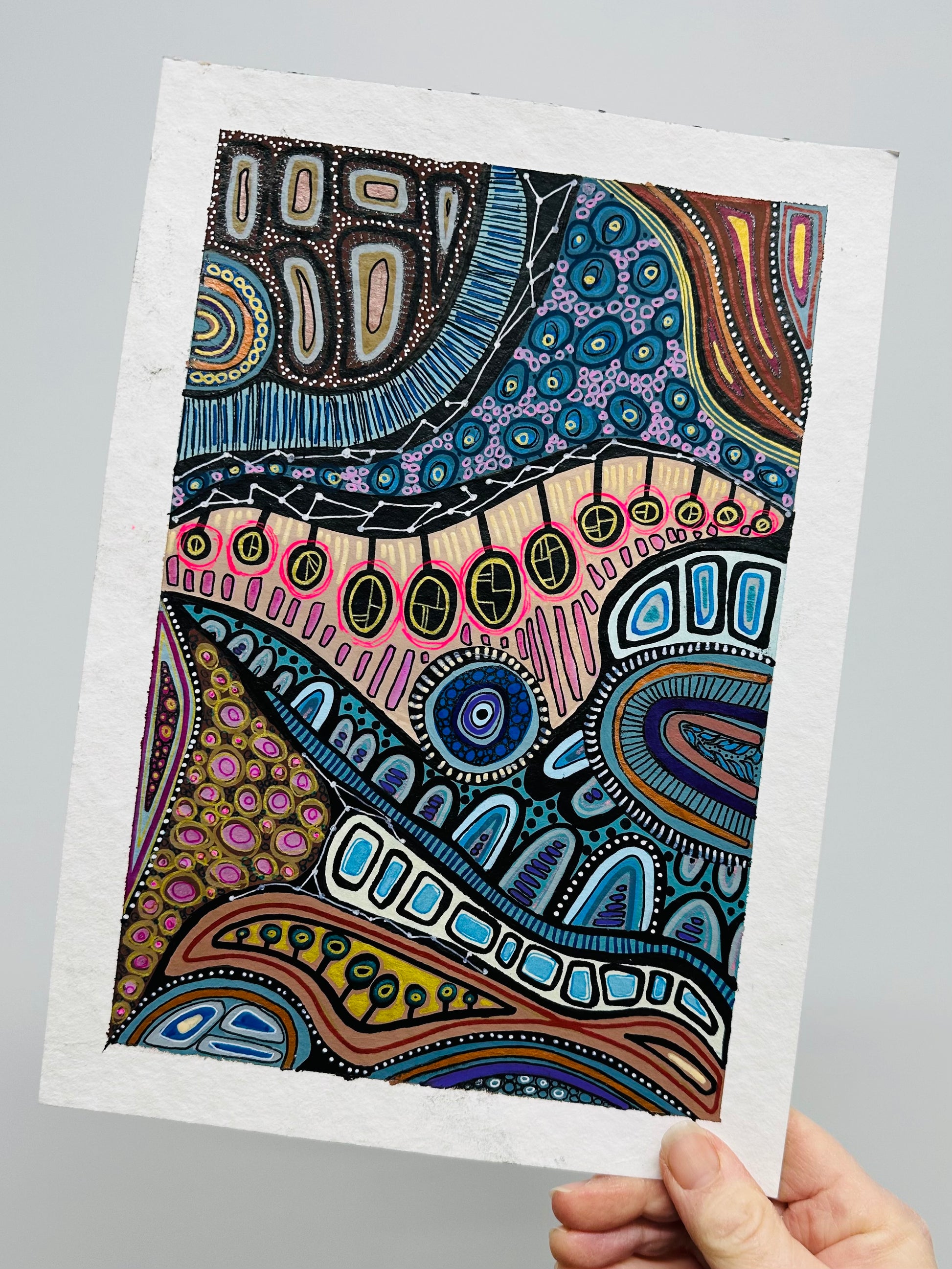 MATERIALS: Acrylic paint, paint and gel pens on 300gsm cotton paper.