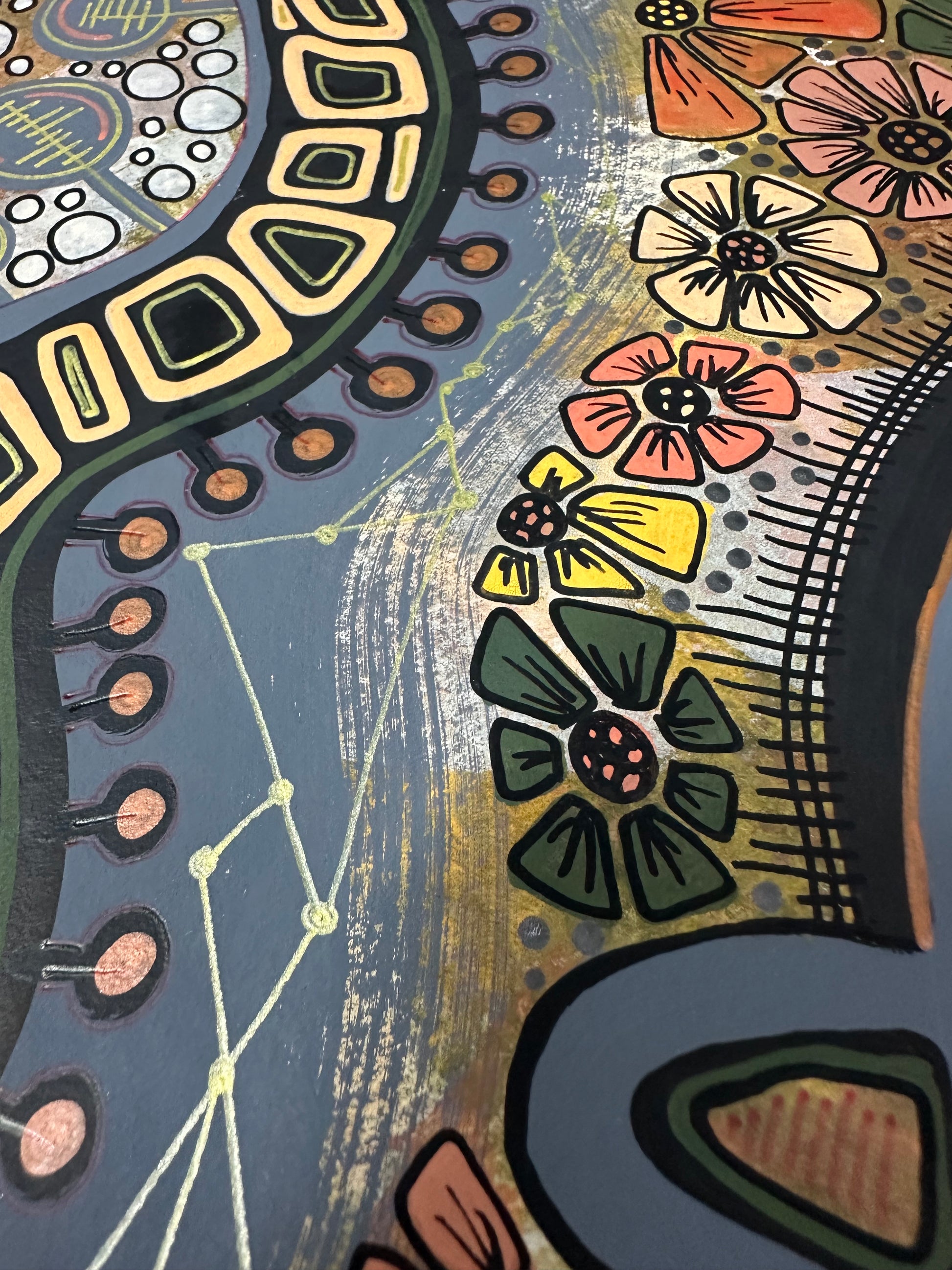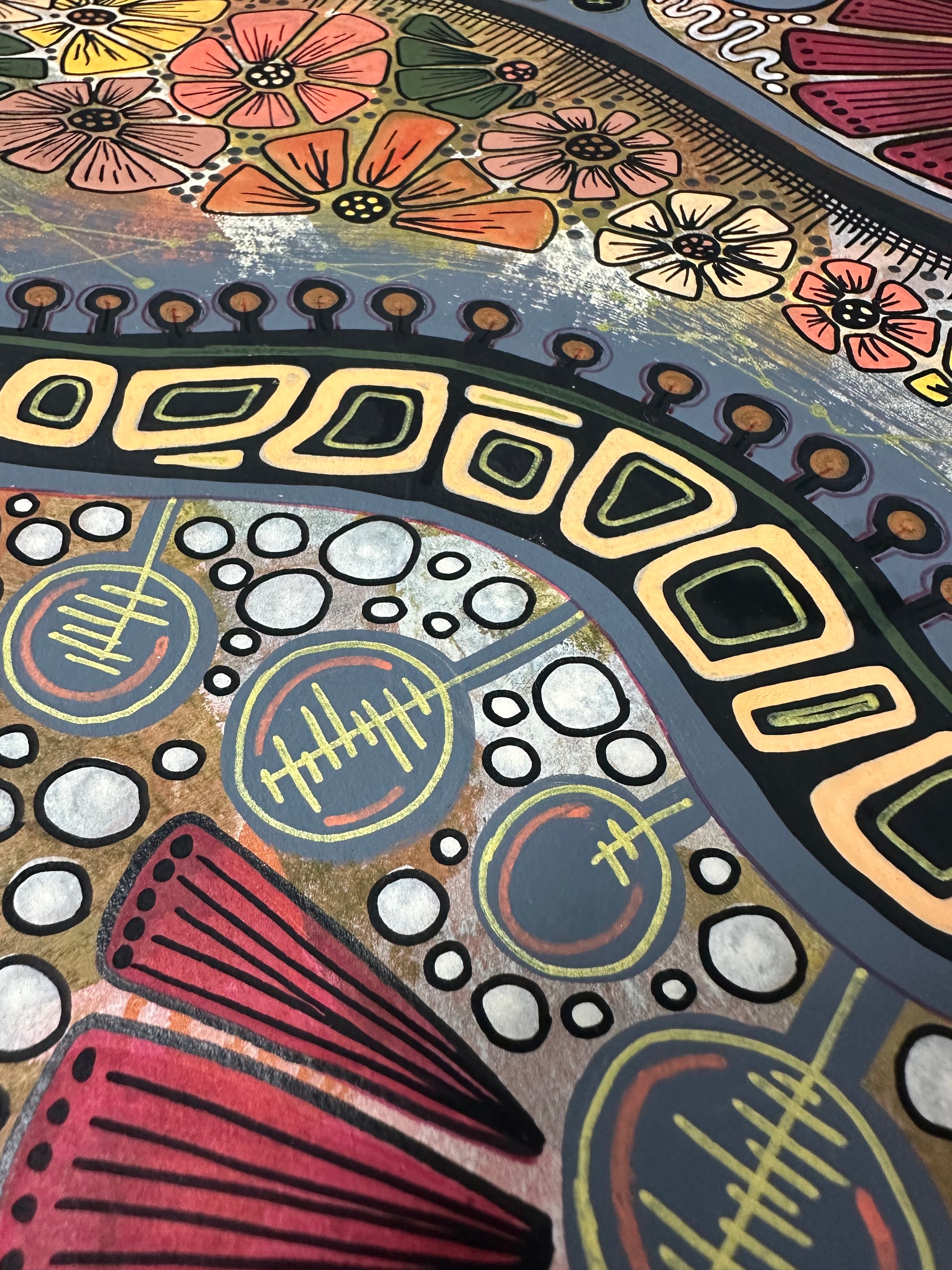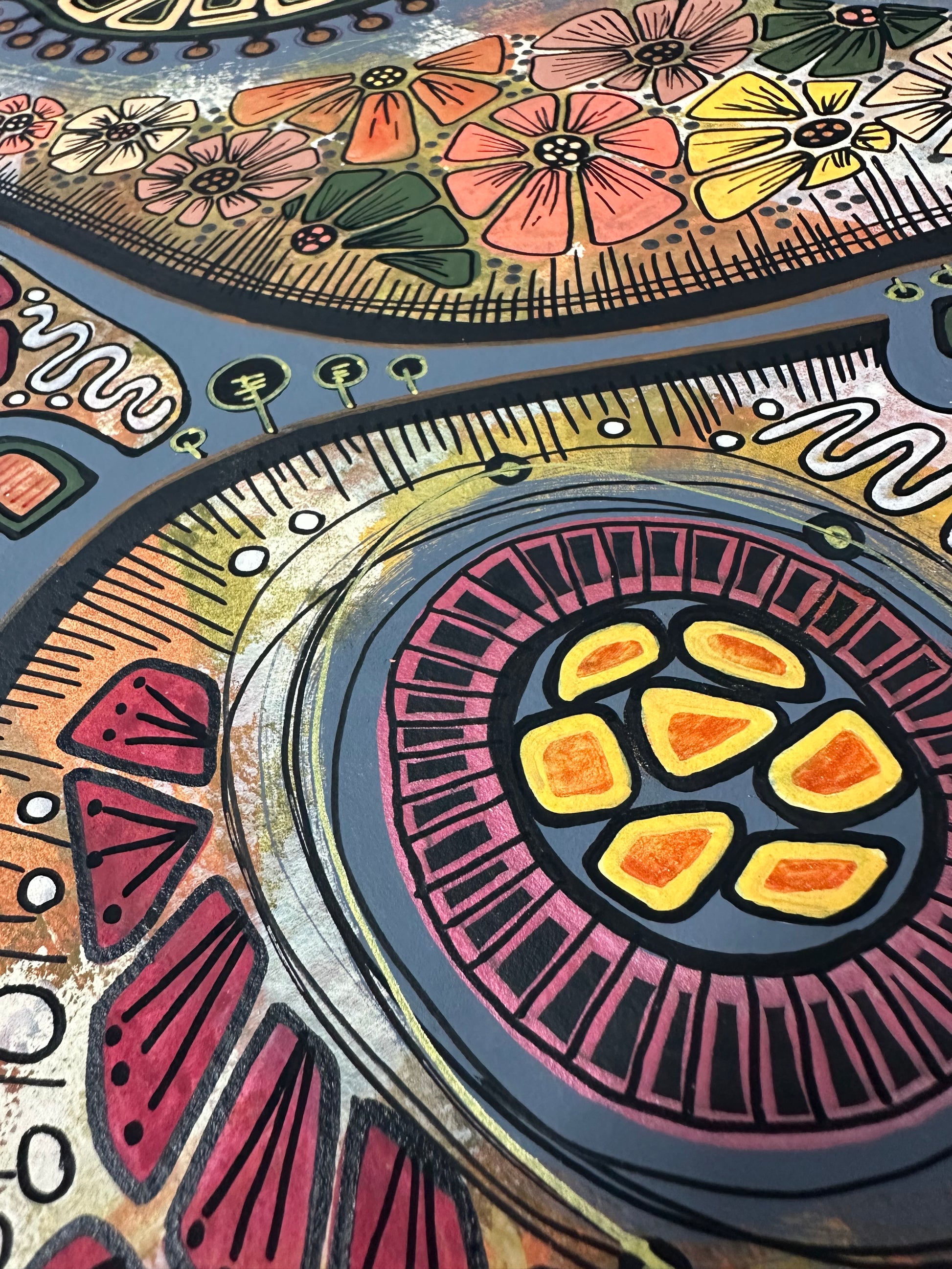 MATERIALS: Acrylic paint, paint and gel pens on 300gsm cotton paper.