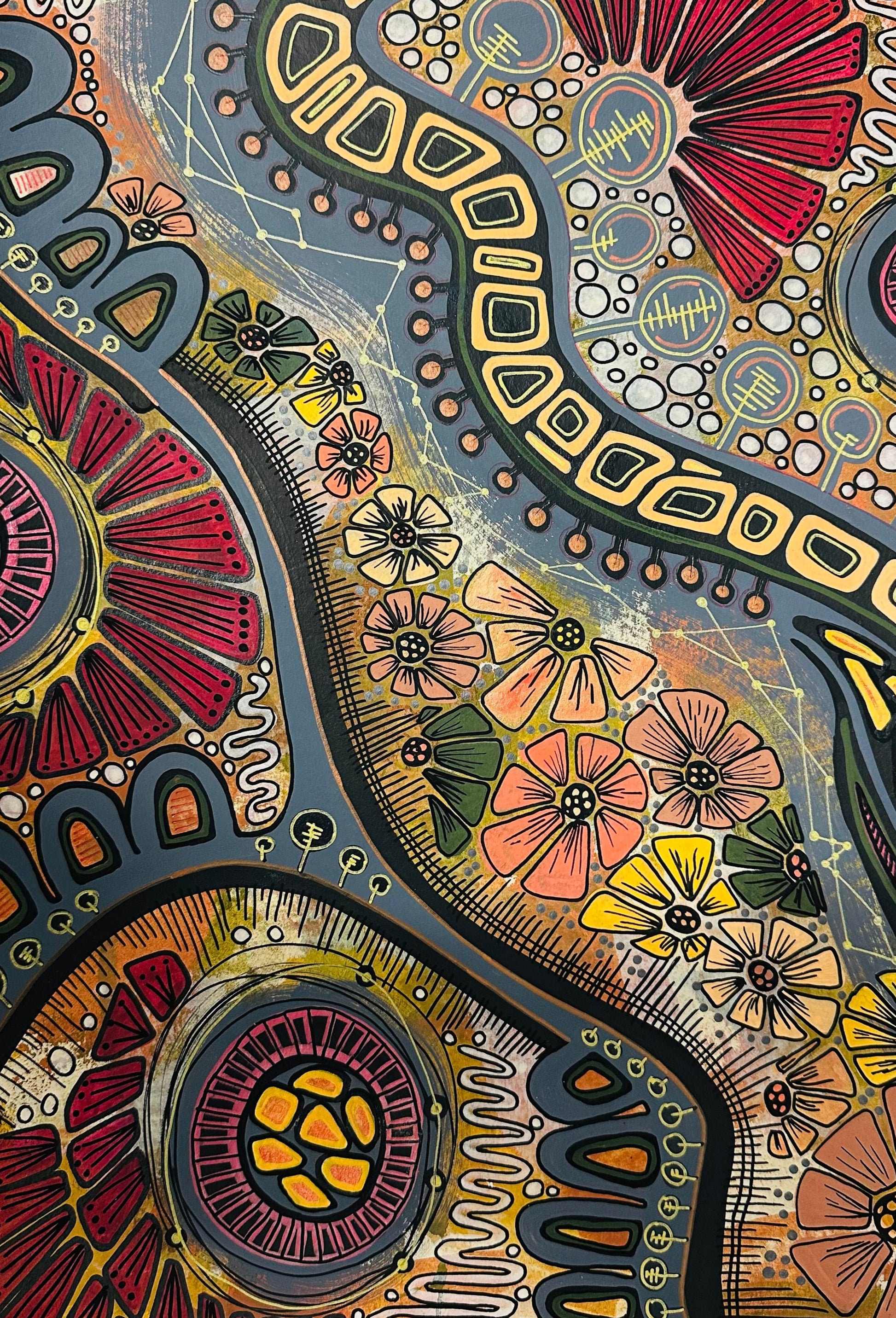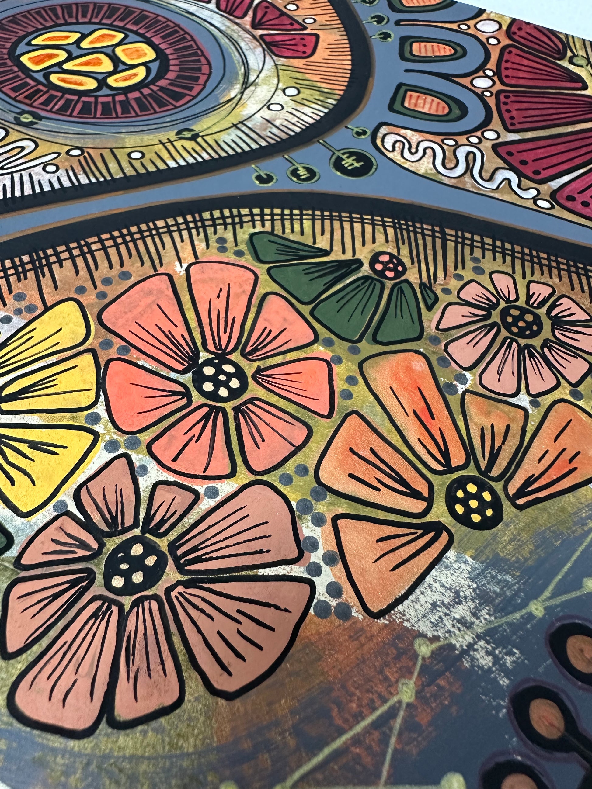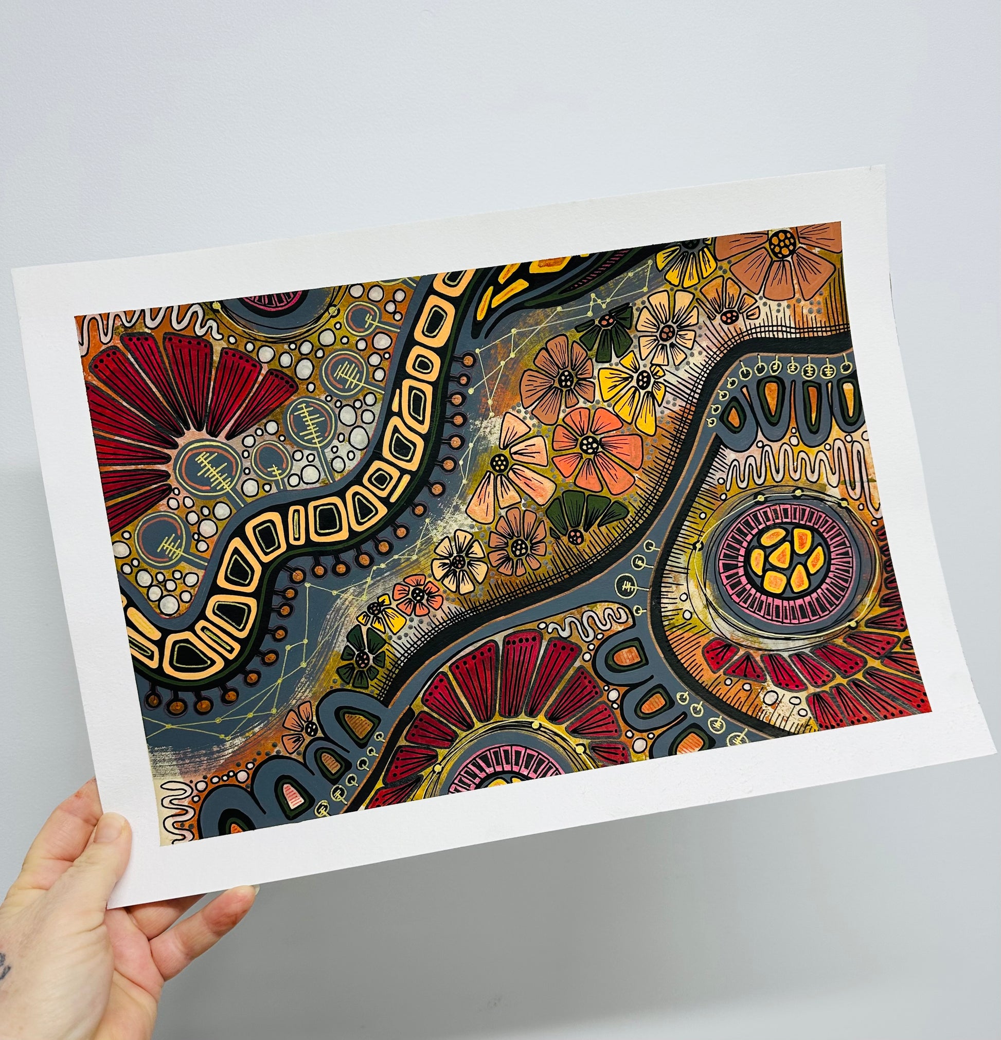 MATERIALS: Acrylic paint, paint and gel pens on 300gsm cotton paper.